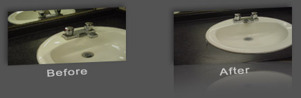 | This sink (left) in a ladies’ room was being cleaned by a company seven days per week. This picture was taken minutes after the outside cleaning vendor completed their daily cleaning. They were cleaning with a hospital-grade germicidal detergent, a glass cleaner, a neutral-based detergent and a bowl cleaner. They were not able to remove the hard water buildup and staining around the faucets and sink drain. |